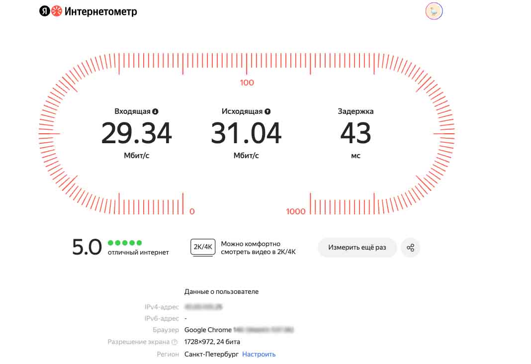 Если к сети подключено много устройств, на время замера полезно убрать лишнюю нагрузку: не включать одновременно видео на телевизоре, скачивание файлов на ноутбуке и обновления на другом устройстве. Иначе Интернетометр покажет не только качество подключения, но и текущую нагрузку внутри квартиры.